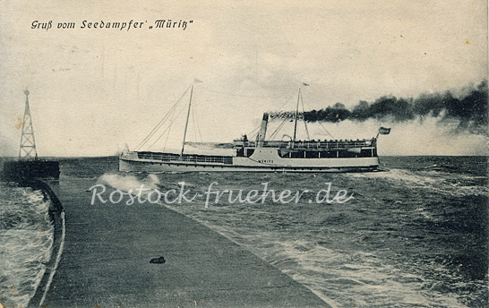 Seedampfer Müritz (wohl vor der Warnemünder Mole). Ansichtskarte, 1910 gelaufen